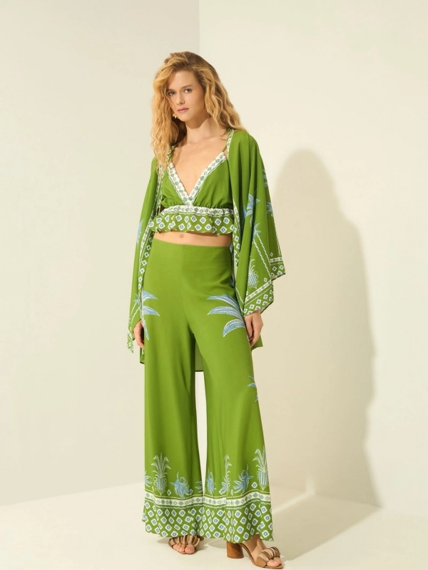Calça pantalona Lez a Lez Verão 2025 em viscose leve, com estampa tropical em tons de verde que traduzem o frescor da estação. O tecido fluido garante conforto e movimento, enquanto o corte amplo valoriza a silhueta com elegância. Peça ideal para compor looks casuais sofisticados, perfeitos para dias ensolarados e viagens cheias de estilo.
