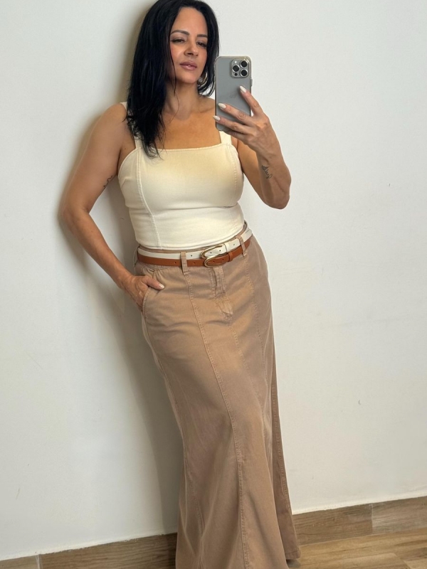 A Saia Longa em Sarja Monnari é o toque de estilo que o seu guarda-roupa de verão (e de meia-estação!) estava pedindo. Feita em sarja leve e estruturada, ela traz caimento impecável, cintura alta e aquele tom terroso sofisticado que combina com absolutamente tudo — do cropped leve à camisa social.